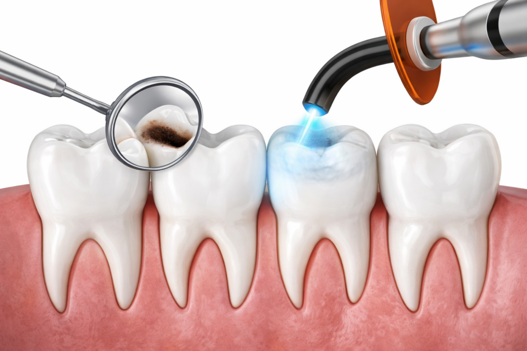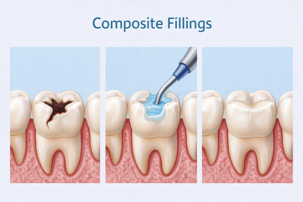 Composite fillings are used to repair teeth affected by decay or minor damage. During the procedure, the decayed portion of the tooth is carefully removed. Once the area is cleaned and free of bacteria, a durable composite resin is applied to restore the tooth’s structure.